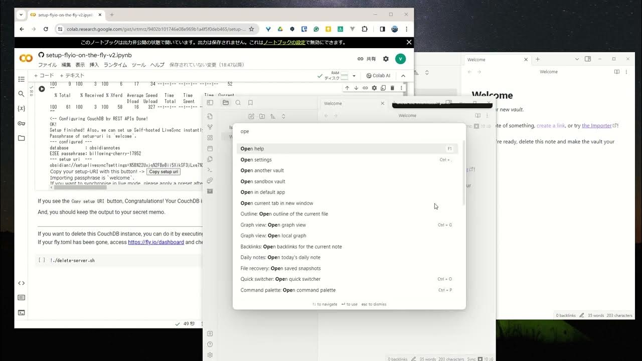 CouchDBのサーバが立ち上がったら、ObsidianのSelf-hosted LiveSyncの設定を行います。以下の手順をPC版ObsidianとiOS版Obsidianの両方で行うことで、同期を開始することができます。